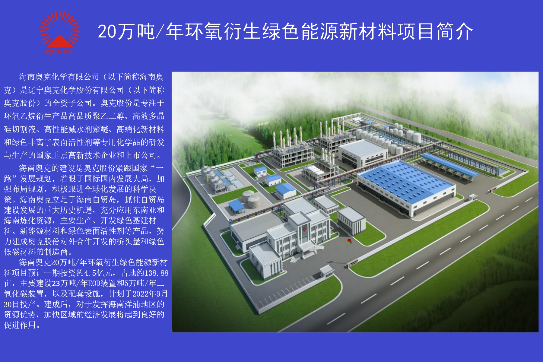 海南奧克是奧克股份在全國五大區(qū)域的拓展,前期在洋浦經(jīng)濟開發(fā)區(qū)工委管委會、中國石化海南煉化公司、中石化化工銷售(海南)公司和洋浦國際等的大力支持下,于2021年2月5日注冊成立,注冊資本11,520萬元,占地面積約140畝,擬投資4.5億元,主要建設23萬噸/年EOD裝置以及配套設施,預計于2022年9月30日建成投產,主要生產、開發(fā)綠色基建材料、新能源材料和綠色表面活性劑等產品。該項目的投資建設,是奧克股份堅持“立足環(huán)氧乙烯創(chuàng)造價值”,滿足華南、海外東南亞不斷擴大市場的戰(zhàn)略需要;是奧克股份依托中石化海南煉化公司環(huán)氧乙烷原料優(yōu)勢資源,為奧克快速發(fā)展和海南地方經(jīng)濟做出貢獻的戰(zhàn)略需要;也是完善奧克的市場營銷網(wǎng)絡體系,打通現(xiàn)有區(qū)位空間格局,共同釋放協(xié)同效應,提升奧克在華南、海外等境內外的市場份額的戰(zhàn)略需要;更是面向奧克“十四五”規(guī)劃及2035遠景目標,邁向現(xiàn)代化、國際化發(fā)展的戰(zhàn)略需要。
